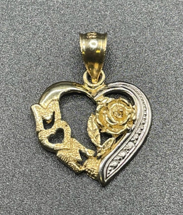 A two colors heart shaped pendant with the word Mom on the lift and a rose on the right