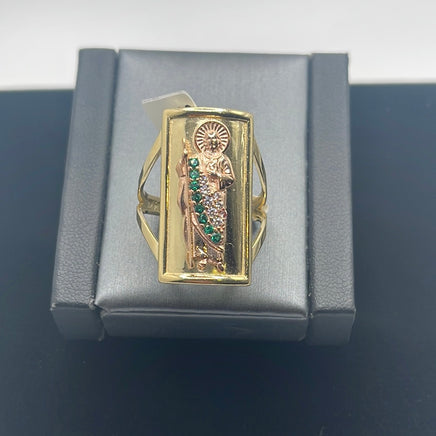 Anillo con el emblema de San Judas y piedras CZ verdes y blancas